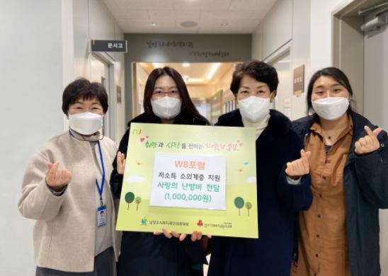[한국뉴스타임=편집국] WB포럼은 지난 17일 남양주시 북부권역 저소득 계층의 한파 대비 따뜻한 겨울나기를 위한 후원금 1백만 원을 남양주시사회복지관 북부희망케어센터에 기탁했다.