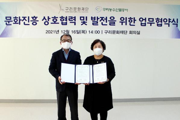 (재)구리문화재단은 16일 구리농수산물공사와 '지역 문화진흥 협력 및 발전을 위한 업무협약'을 체결했다. 이날 협약식에는 구리문화재단 조영숙 대표이사, 구리농수산물공사 김성수 사장 및 각 기관 실무자들이 참석했다.