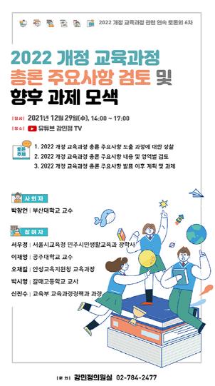 [한국뉴스타임=편집국] 강민정 의원(열린민주당 원내대표, 교육위원회)은 오는 12월 29일 오후 2시부터 ‘2022 개정 교육과정 총론 주요사항 검토 및 향후 과제 모색’ 토론회를 개최한다. 이번 토론회는 코로나19에 따른 거리두기 준수 및 열린 시민 참여를 위해 유튜브 ‘강민정TV’에서 생중계하는 온라인 토론회로 진행된다.
