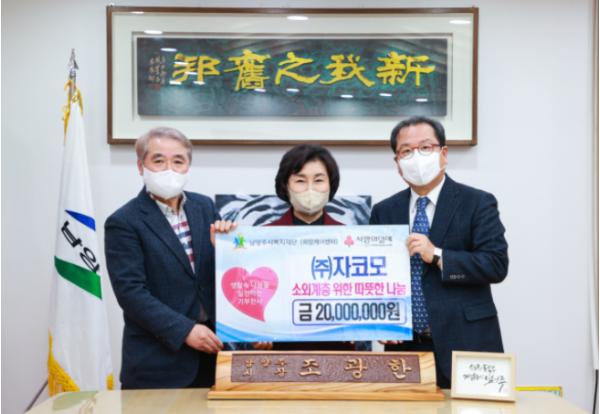 [한국뉴스타임=편집국] 남양주시는 27일 ㈜자코모(대표이사 박경분)가 지역의 취약계층을 위해 후원금 2000만원을 남양주시복지재단(대표이사 우상현)에 전달했다고 밝혔다.