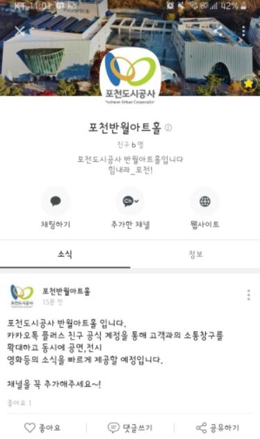 포천반월아트홀 유동석 관장은 “더 많은 시민과 가깝게 소통하기 위해 접근이 쉬운 대표적인 모바일 중심의 채널 카카오톡 플러스친구 서비스를 공식 개설하게 되었다.”며 “앞으로 해당 채널을 활용한 간편하고 신속한 고객서비스를 통해 ‘시민과 함께 사회적 가치를 창조하는 Best 공기업’으로 자리매김할 계획이다.”라고 밝혔다.