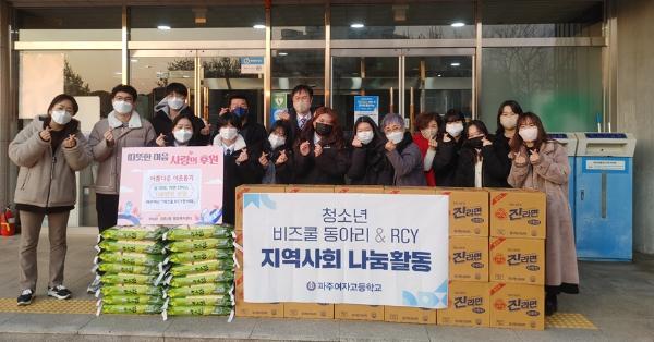 [한국뉴스타임=편집국] 파주시 금촌3동(동장 이창우)은 파주여고(교장 황대연) 비즈쿨 창업동아리와 RCY 동아리가 지난 24일 금촌3동 소외된 이웃을 위해 쌀 10kg 30포와 라면 18상자(150만원 상당)를 기부했다고 밝혔다.