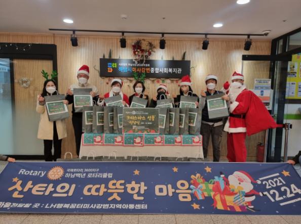 [한국뉴스타임=편집국] 하남백년로터리클럽 이상금회장은 지난 12월24일 로터리클럽회원들과 함께 하남시미사강변종합사회복지관(조혜연관장)에 산타의 따뜻한 마음을 전달하기 위해 백만원상당의 아동의류를 전달하였다.