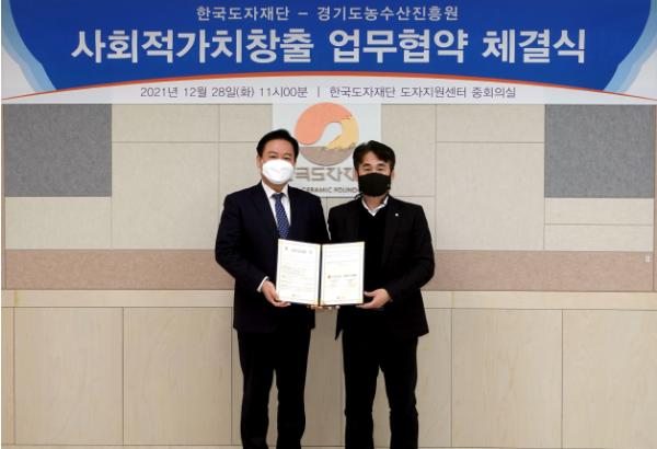 [한국뉴스타임=편집국] 한국도자재단과 경기도농수산진흥원이 28일 재단 도자지원센터에서 경기도 도자문화 확산과 농수산물 소비 촉진을 위한 ‘사회적 가치 창출’ 업무협약을 체결했다.