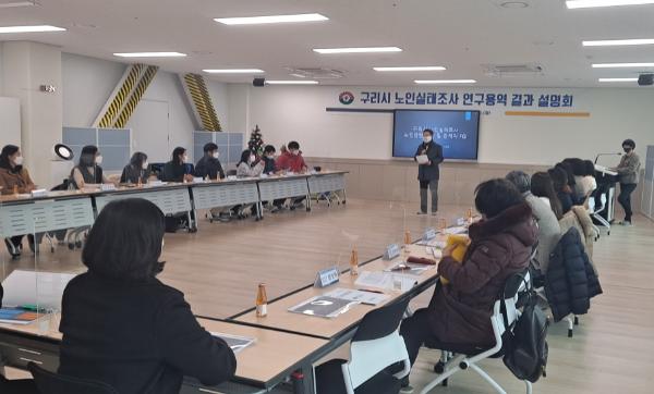 설명회에는 대한노인회 구리시지회 장수용 지회장을 비롯한 15개 기관 29명의 노인복지 관계기관과 용역관계자 등이 참석했다. 용역 수행사인 사단법인 도시경제연구원(대표 김화복) 김효정 책임연구원의 진행으로 '구리시 노인실태 및 대상별 욕구조사' 결과 보고를 통한 연구 결과 공유와 질의 응답, 노인복지 발전방안을 위한 다양한 의견수렴과 집단심층면접 등이 함께 진행되었다.