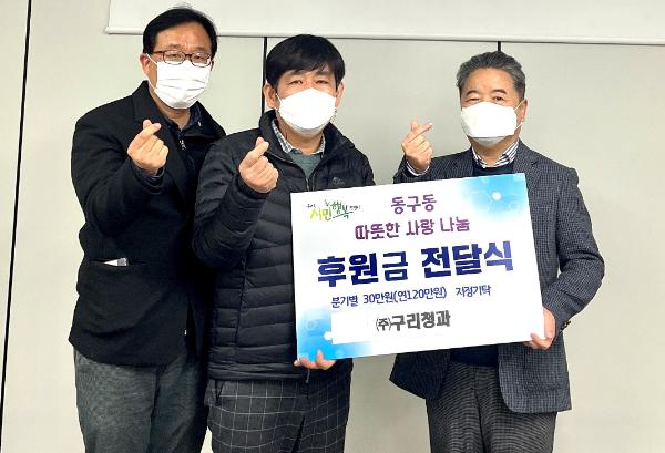 이날 전달식에는 이석우 대표이사, 전우종 부장 등이 참석한 가운데, ㈜구리청과는 동구동 행정복지센터에 분기별 30만 원씩 연간 120만 원을 기탁할 것을 약정했다.