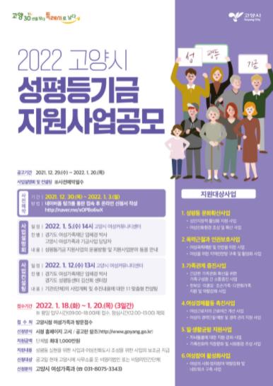 [한국뉴스타임=편집국] 고양시가 우수한 성평등 사업을 발굴하고 지원하기 위해 2022년도 고양시 성평등기금 지원사업을 공개모집한다.