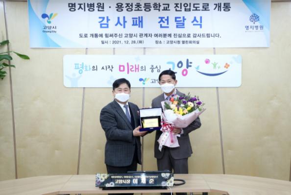 [한국뉴스타임=편집국] 고양시가 호국로에서 명지병원을 직접 연결하는 진입도로를 개설한 것에 대한 감사 표시로 명지병원으로부터 감사패를 전달받고 지난 28일 전달식을 개최했다.