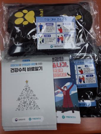 가평군보건소 9명의 방문전문인력은 한파에 대비하여 2,400여명의 건강취약 대상자들에게 전화 또는 가정 방문을 통해 한랭질환 예방 등 겨울철 건강관리방법을 교육하고, 방한용품(넥워머, 발열덧신 등)과 교육 리플릿 등을 배부하여 방문건강관리에 만전을 기하고 있다.