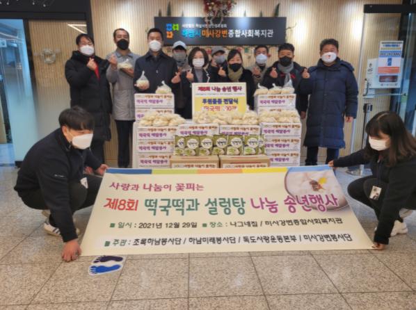 독도사랑하남운동본부(회장 이운범), 미사강변봉사단(단장 배순옥), 초록하남봉사단·하남미래봉사단(단장 양보라매)은 연말연시를 맞이하여 나눔 송년 행사로 지역 내 취약계층 대상자들에게 떡국떡 300개, 사골국 120개(약300인분) 상당의 물품을 하남시미사강변종합사회복지관(관장 조혜연)에 전달하였다.