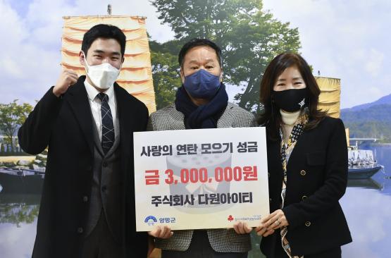 [한국뉴스타임=편집국] 지난 30일, (주)다원아이티에서 작년 읍면 성금 기부에 이어 양평군에 ‘2021년 사랑의 연탄 모으기 운동’ 성금 300만원을 기탁하면서 따뜻한 마음을 전했다.