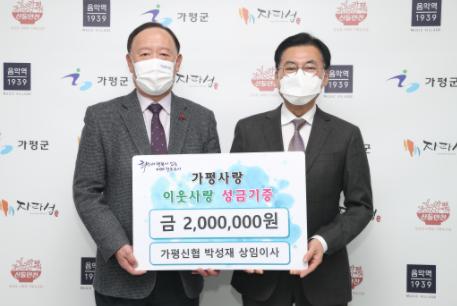 [한국뉴스타임=편집국] 지난 12월 30일 가평신협 박성재 상임이사는 이웃돕기 성금 200만원을 군에 기탁하여 전달식을 가졌다.