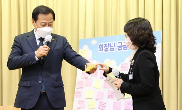 이어 직급 및 부서별로 선정된 직원들이 참여한 감사 메시지 영상을 시청하는 한편, 평소 의장에게 궁금한 사항을 주제로 직원들과 대화하는 시간을 가졌다.