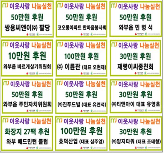 △(주)티앤아이(대표 유영호) 30만원, △(주)양지타워(대표 조태형) 30만원, △코오롱아파트한마음봉사단(단장 김정석) 50만원, △(주)쌍용씨앤이(대표 최봉준) 50만원, △효덕산업(대표 심주영) 100만원, △주민 민병석 50만원, △재령이씨종친회(회장 이갑주) 30만원, △(주)이륜관(대표 오현제) 100만원, △와부읍 주민자치위원회(위원장 오수국) 50만원, △와부읍 바르게살기위원회(회장 이갑주) 10만원, △(주)진푸드빌(대표 유인석) 50만원, △와부베드민턴클럽(회장 김동수) 58만원 상당의 두루말이 휴지 27팩 등을 후원해 주신 와부읍 사회단체와 기업, 주민에게 감사의 뜻을 전달했다.