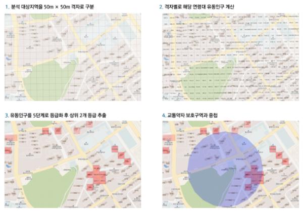 이번 분석은 이런 문제를 해소하고 보호구역 관리를 위한 과학적-통일적 관리 기준을 도출하기 위한 것으로, 분석을 위해 ①경기남부 전역을 50×50m의 격자 약 23만 개로 분할하고, ②격자별로 어린이(10세 미만)와 노인 연령대(60대 이상)의 통신사 유동인구를 입력한 다음 ③시군별 유동인구 밀집도를 5단계로 분류한 뒤 ④경찰에서 관리중인 보호구역과 교통사고 발생현황을 입력해 보호구역 관리에 필요한 교통자료를 지리정보시스템상에 구현했다.