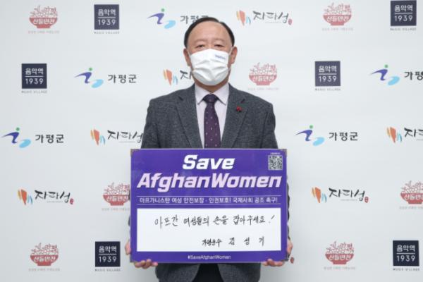 [한국뉴스타임=편집국] 김성기 가평군수는 지난4일, 아프가니스탄 여성 인권보장을 위한 국제사회의 공조를 촉구하는 ‘세이브 아프간 위민(Save Afghan Women)’ 챌린지에 동참했다.
