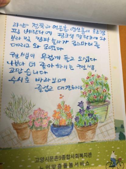 문촌9종합사회복지관은 ‘화초야 놀자’ 참여 어르신 중 6명을 선정해 소정의 상품을 제공했다. 수상한 어르신은 “예쁜 꽃을 보고 그림을 그리는 것만으로 행복했는데 이렇게 선물까지 받으니 너무 좋다”라고 소감을 전했다.