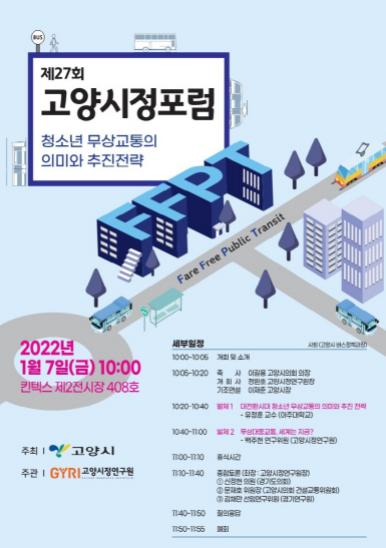 [한국뉴스타임=편집국] 고양시가 오는 7일 10시 킨텍스 제2전시장에서 청소년 교통비 무료화 방안 논의를 위한 ‘제27회 고양시정포럼’을 개최한다.