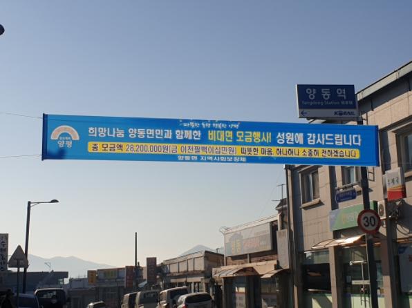 이번 모금행사는 거리공연이 없는 비대면 행사임에도 불구하고 이장협의회, 새마을협의회, 양동청년회, 적십자봉사회, 부추작목반, 대산축산농장, 양동신협, 양평축협양동점, 양동성당, 단석교회 등 많은 단체와 개인이 한마음 한뜻으로 기부에 동참해 2820만원 이라는 큰 정성이 모였다.