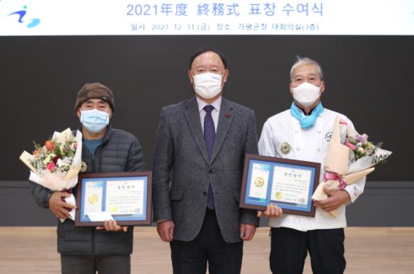 [한국뉴스타임=편집국] 가평군은 2021년도 가평군 장인으로 건축목공 박영환씨(58세)와 제과제빵 김선기(63세)씨를 선정 증서와 명패를 수여했다.