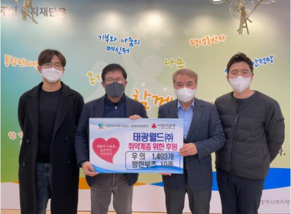 [한국뉴스타임=편집국] 태광월드㈜는 취약계층을 위해 사용해 달라며 지난 4일 고품질 우의 1,493개 및 방한부츠 10족(1,000만원 상당)을 남양주시복지재단에 전달했다.