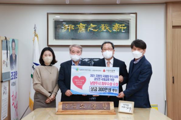 [한국뉴스타임=편집국] 남양주시는 ‘2021 지방의 국제화 우수사례 공모전’에서 최우수상을 수상하며 받은 상금 300만원을 지난 4일 남양주시복지재단에 전달했다.