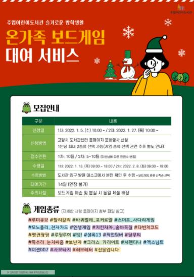 [한국뉴스타임=편집국] 고양시 주엽어린이도서관은 1월 13일부터 ‘온가족 보드게임 대여 서비스 시즌2’를 운영한다.