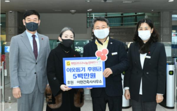 또한, 이웃돕기 기부금은 경기 사회복지공동모금회로 지정 기탁되어 취약계층 가구에 배부될 예정으로, 이현건축사사무소는 기부금을 전달하며 기부금이 어려운 이웃들에게 잘 전달되었으면 좋겠다는 의사를 밝혔다.
