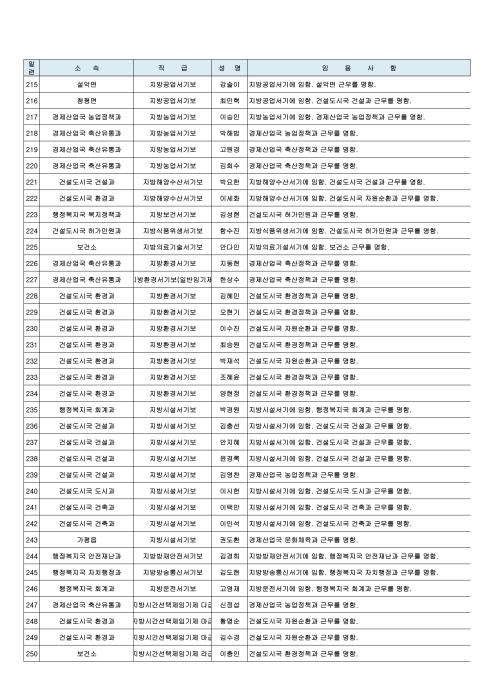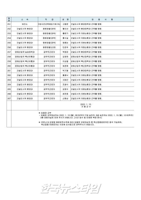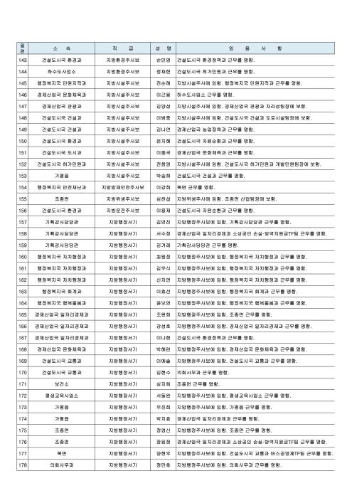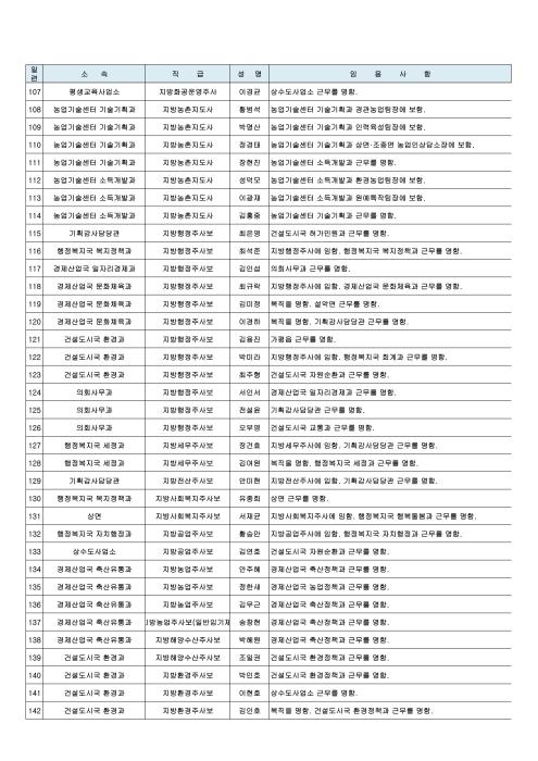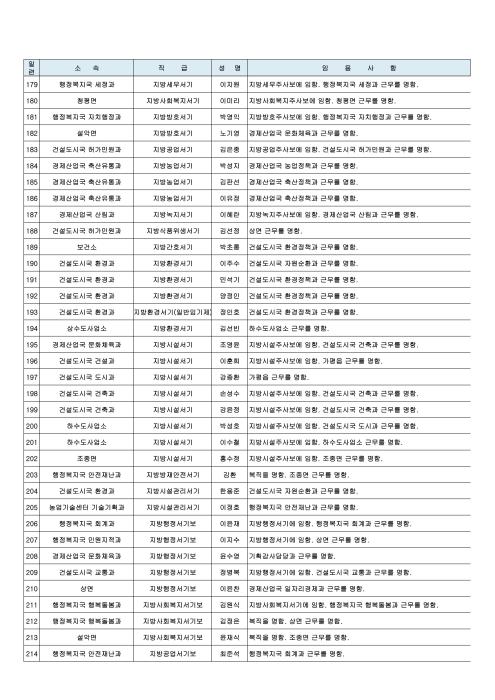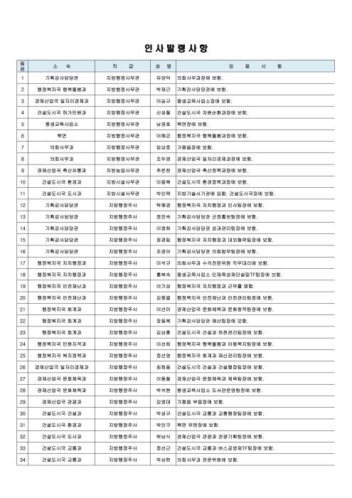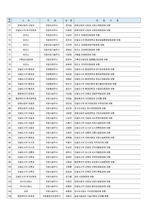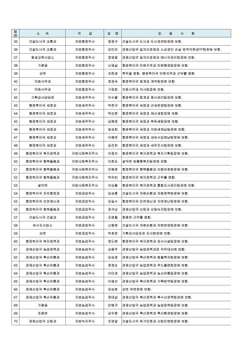 이날 인사에서 서기관(4급) 건설도시국장에 박인택 도시과장, 사무관(5급) 의회사무과 수석전문위원(대)에 이석규 인사팀장, 농업정책과장(대)에 김용주 농업정책팀장, 도시과장(대)에 박형규 도시계획팀장, 허가민원과장(대)에 임진섭 자라섬팀장이 승진 임명되었다.
