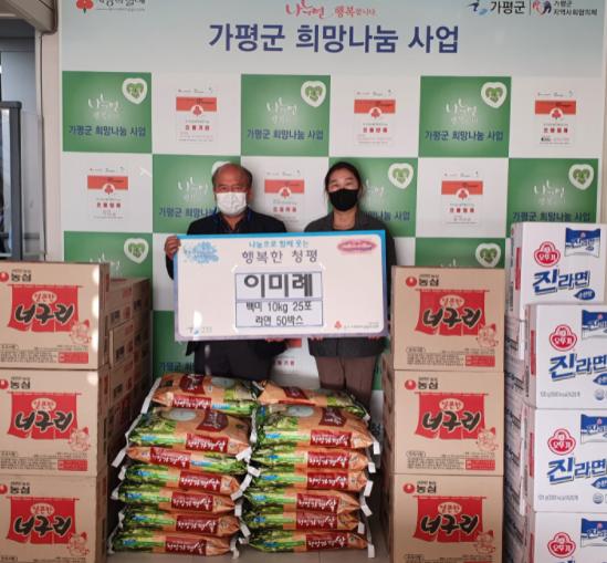 [한국뉴스타임=편집국] 지난 01월 03일 이미례 부부가 청평면 행정복지센터를 방문하여 라면 및 백미를 맞춤형복지팀에 전달했다.