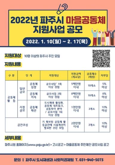 [한국뉴스타임=편집국] 파주시는 ‘2022년 파주시 마을공동체 주민제안 공모사업’에 참여할 공동체를 2월 17일까지 공개모집한다.