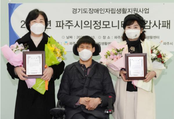 [한국뉴스타임=편집국] 파주시의회는 박은주, 이효숙 의원이 장애인 인권 신장을 위한 의정활동을 펼친 공을 인정받아 파주자유로장애인자립생활센터로부터 감사패를 수여받았다고 10일 밝혔다.