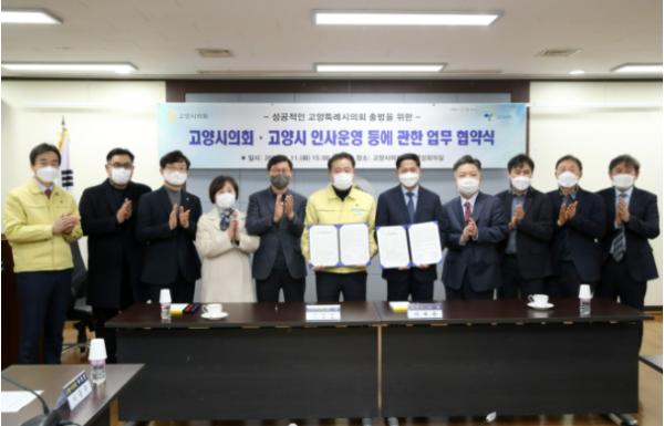 이날 협약식은 1월 11일 의회 4층 영상회의실에서 이길용 의장과 이재준 시장이 참석한 가운데 열렸으며, 지방자치법 전부 개정으로 지방의회 사무직원에 대한 인사 권한이 지방의회 의장에게 부여됨에 따라 차질 없는 업무 수행을 위한 근거를 마련하고 양 기관의 조화로운 업무 이관과 고양시의회 인사권 독립의 안정적 정착을 위해 이뤄졌다.