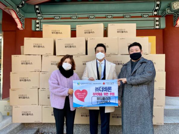 이날 주식회사 더바론이 기부한 물품은 상아제약 콜라겐 제품 3종(타트체리 비타톡톡, 리얼콜라겐 뷰티플러스, 리얼자몽 뷰티톡톡)으로, 비타민과 콜라겐을 동시에 챙길 수 있는 제품들로 구성돼 취약계층의 건강 증진과 피부 건강에 도움을 줄 것으로 기대된다.