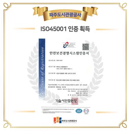 [한국뉴스타임=편집국] 파주도시관광공사는 지난 연말 국제표준 안전보건경영시스템(ISO45001) 사후 인증을 취득했다고 밝혔다.