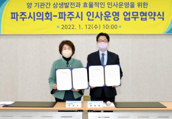 [한국뉴스타임=편집국] 파주시의회는 1월 12일 지방의회 인사권 독립의 안정적 정착과 효율적인 인사 협력체계 구축을 위해 파주시와 업무협약을 체결했다.