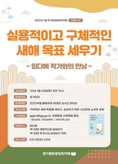 [한국뉴스타임=편집국] 경기도는 임인년 새해를 맞아 코로나19 장기화로 독서·문화 활동이 어려운 도민들을 위해 경기평화광장 북카페에서 올해 첫 ‘문화의 날’ 강좌를 마련했다고 13일 밝혔다.