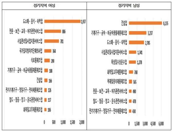 보고서에 따르면 2020년 경기도 산업재해자 2만7,635명 중 여성은 5,969명(전체 21.6%), 남성은 2만1,666명이다. 성별 산업재해 업종 비율을 보면 여성은 ▲도소매?음식?숙박업(35.4%) ▲보건?교육 등(17.5%) ▲시설관리 및 지원서비스업(13.6%) 등의 순이고, 남성은 ▲건설업(30.5%) ▲기계기구?비금속?금속제품 제조업(17.4%) ▲도소매?음식?숙박업(14.2%) 등의 순이다.