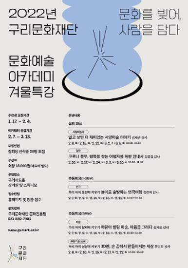 [한국뉴스타임=편집국] 구리문화재단이 오는 1월 17일부터 '2022년 문화예술 아카데미 겨울특강' 수강생을 모집한다고 밝혔다.