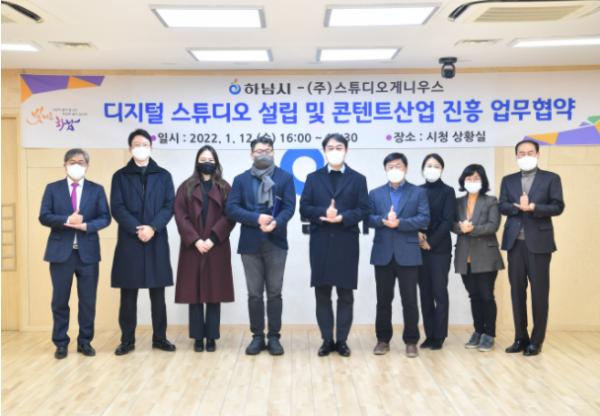 [한국뉴스타임=편집국] 하남시는 지난 12일 ㈜스튜디오게니우스와 업무협약을 맺고 하남시 문화산업 생태계 강화를 위해 상호 협력하기로 했다고 밝혔다.