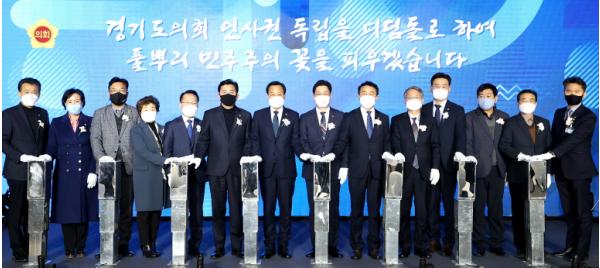 이어진 비전선포 세레모니에서 장현국 의장과 초청된 내빈들이 터치버튼을 누르자 LED 전광판에 “경기도의회 인사권 독립을 디딤돌로 하여 풀뿌리 민주주의 꽃을 피우겠습니다”라는 경기도의회 인사권 독립의 비전이 발표됐다.