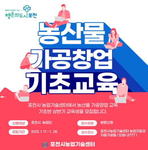 [한국뉴스타임=편집국] 포천시농업기술센터는 1월 17일부터 1월 28일까지 관내 농산물가공창업을 희망하는 농업인을 대상으로 농산물가공 창업교육 기초반 교육생을 모집한다.
