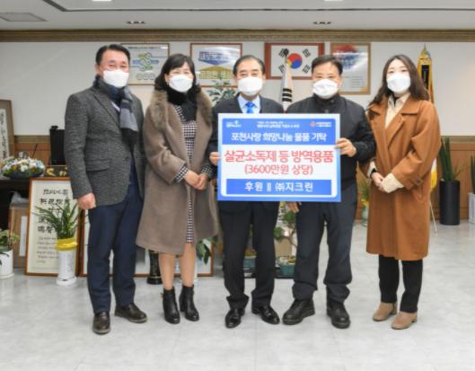[한국뉴스타임=편집국] ㈜지크린은 지난 10일 코로나19 극복에 힘을 보태고 싶다며 3600만 원 상당의 살균소득제 등 방역물품을 사회복지공동모금회를 통해 포천시에 기탁했다.
