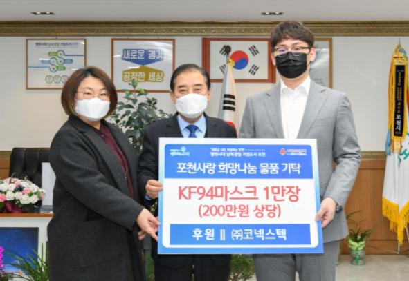 [한국뉴스타임=편집국] ㈜코넥스텍은 지난 11일 코로나19 극복을 위한 200만 원 상당의 KF94 마스크 1만 장을 사회복지공동모금회를 통해 포천시에 전달했다.