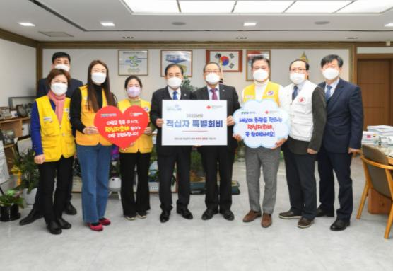 [한국뉴스타임=편집국] 포천시는 13일 집무실에서 2022년 적십자 특별회비를 전달했다. 이날 전달식에는 대한적십자사 경기도지사(회장 윤신일)을 비롯해 대한적십자사 포천지구협의회 회장 등 대한적십자사 포천지구협의회 회원 3명도 함께 참석했다.
