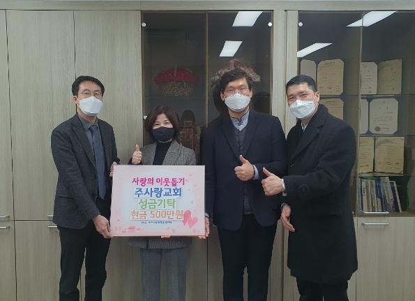 주사랑교회는 작년에 이어 올해도 신도들이 함께 십시일반 마련한 성금 5백만원을 지역사회 소외된 이웃들을 위해 후원했다. 코로나19 이전에는 매년 소외된 이웃들에게 ‘사랑의 쌀’을 전달하며 이웃사랑을 실천했고, 코로나19로 대면 전달이 어려워지자 성금을 모아 기탁하게 되었다. 최정도 주사랑 교회 담임 목사는 “신도들과 함께 따뜻한 마음을 모아 올해도 이렇게 나눔을 실천하게 되어 기쁘다”며 “우리 지역의 어려운 이웃들에게 작은 보탬이 되기를 희망한다”고 말했다.