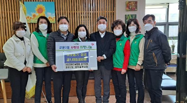전달받은 성금 1백만원은 교문2동 새마을부녀회를 통해 교문2동 관내 독거어르신들에게 추후 설 명절 맞이 음식과 물품 대접할 예정이다.