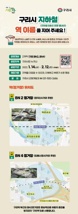 공모 기간은 2022. 1. 14. ~ 2022. 2. 12. 까지이며 구리시청 홈페이지에서 직접 제안하거나 공모 서식에 역사 명칭과 제안 이유를 적어 구리시청 담당부서로 팩스 또는 이메일 접수가 가능하다.