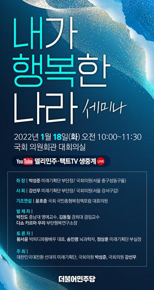 한편, 선대위 미래기획단 ‘내가 행복한 나라’ 세미나는 더불어민주당 유튜브 채널 ‘델리민주’ 등을 통해 실시간 중계될 예정이다. 많은 관심과 시청을 당부드린다.