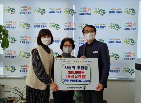 [한국뉴스타임=편집국] 구리시 갈매동 명예사회복지공무원 이덕분씨는 17일 갈매동 행정복지센터를 방문해 갈매동 소외계층을 위해 사용해 달라며 후원금 30만원 전달했다.